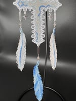 This Blue Cross Dreamcatcher is made of Metallic silver thread, Floriani white thread and variegated blue thread. This Dreamcatcher features three variegated feathers connected with silver gem chain, three silver cross charms and a pearl charm hanger. With this Dreamcatcher you can choose to add a fully embroidered 3d Vine made of our white Floriani thread to have wrapped around your stand. Made in the USA.