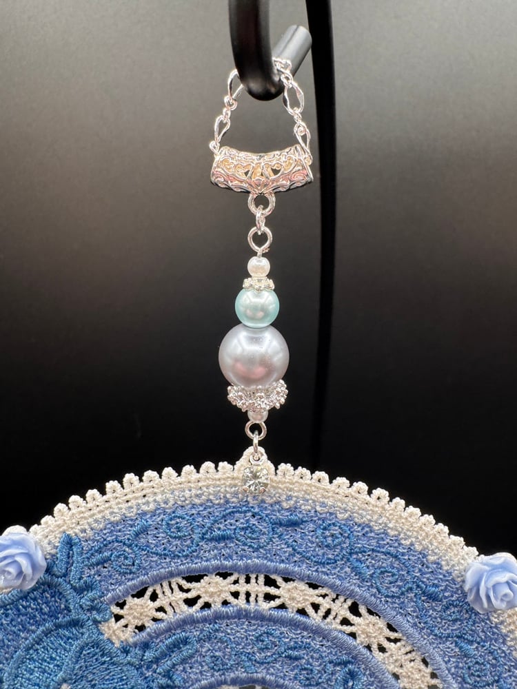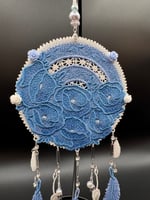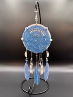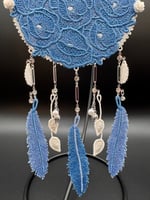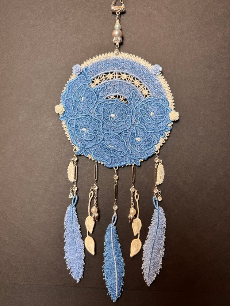 This is a handmade embroidered Dreamcatcher featuring a two-tone periwinkle blue floral display with a cream frame, 3 full-size feathers, dangle gem connector chain, single vines, & various charms.