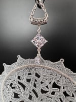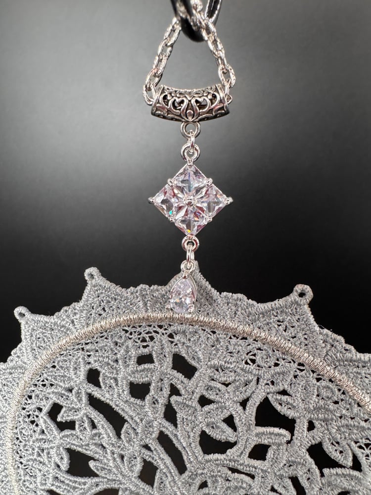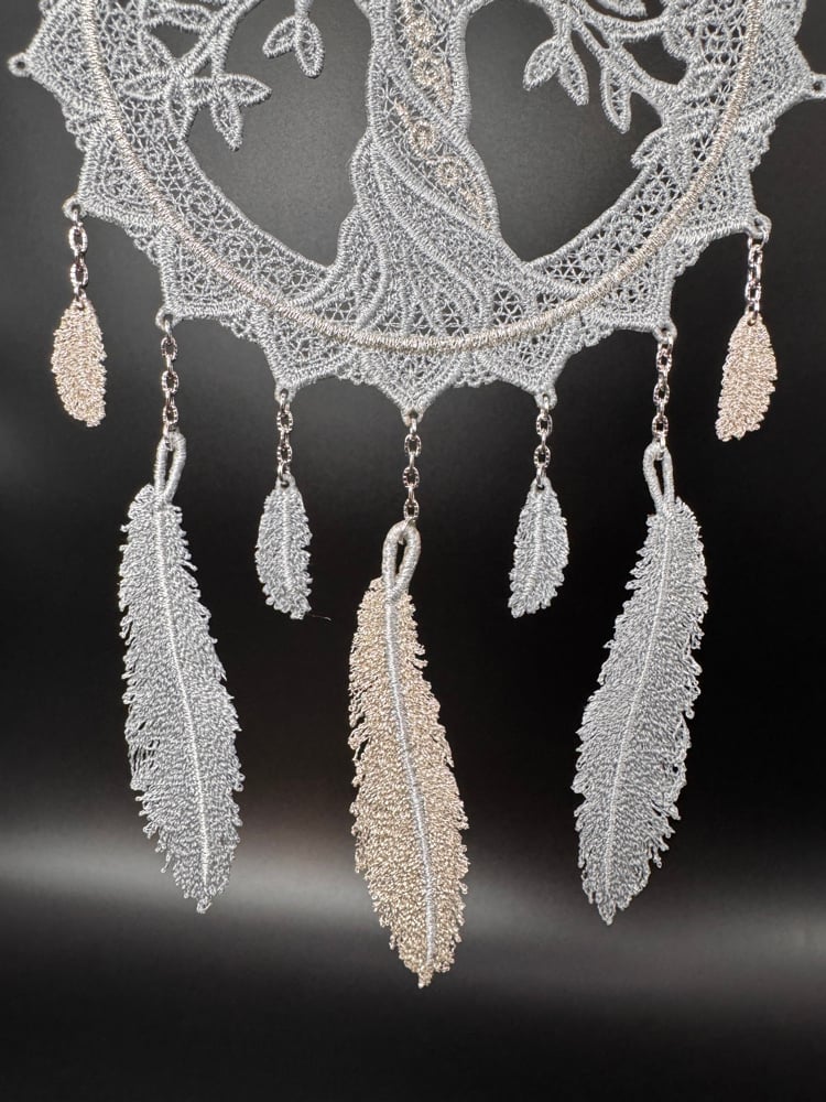 This Grey Tree Of Life Dreamcatcher is made of Floriani and metallic silver embroidery thread. This Dreamcatcher features multiple grey feathers and mini feathers, multiple silver metallic feather and mini feathers along with a square colorless gem hanger. This Dreamcacther can come with a fully embroidered 3d metaillic free standing lace ivy vine intertwined with the stand. Made in the USA.