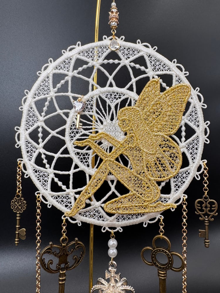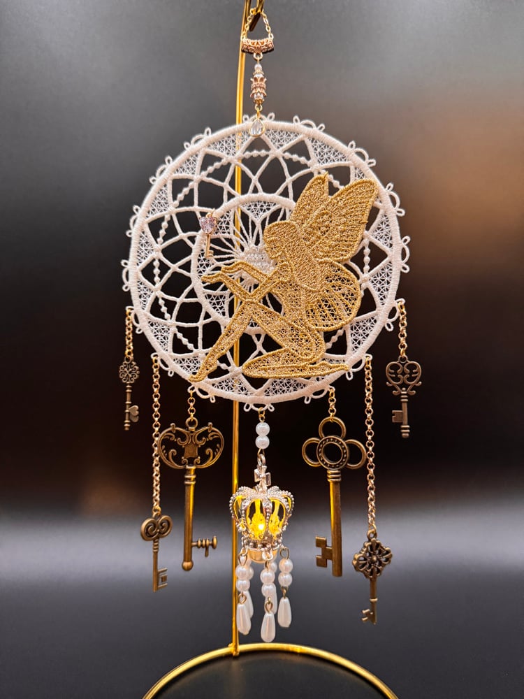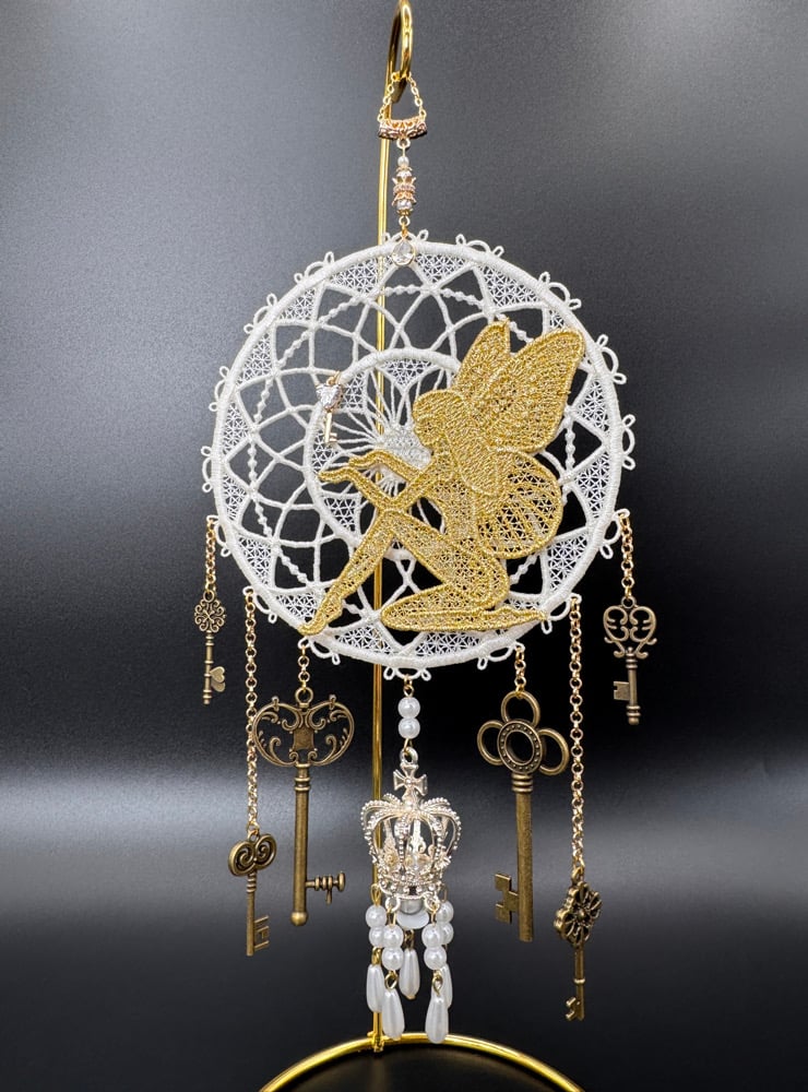 This Mandala Fairy Key Dreamcatcher is made of metallic thread and Florianni embroidery thread. This Dreamcatcher Features multiple metal key pendants, a functional lantern charm, a colorless heart key charm & pearl charm hanger. When the Dreamcatcher moves around you can hear a subtle chiming from the keys. One extra set of batteries for the lantern will be included. Made in the USA.