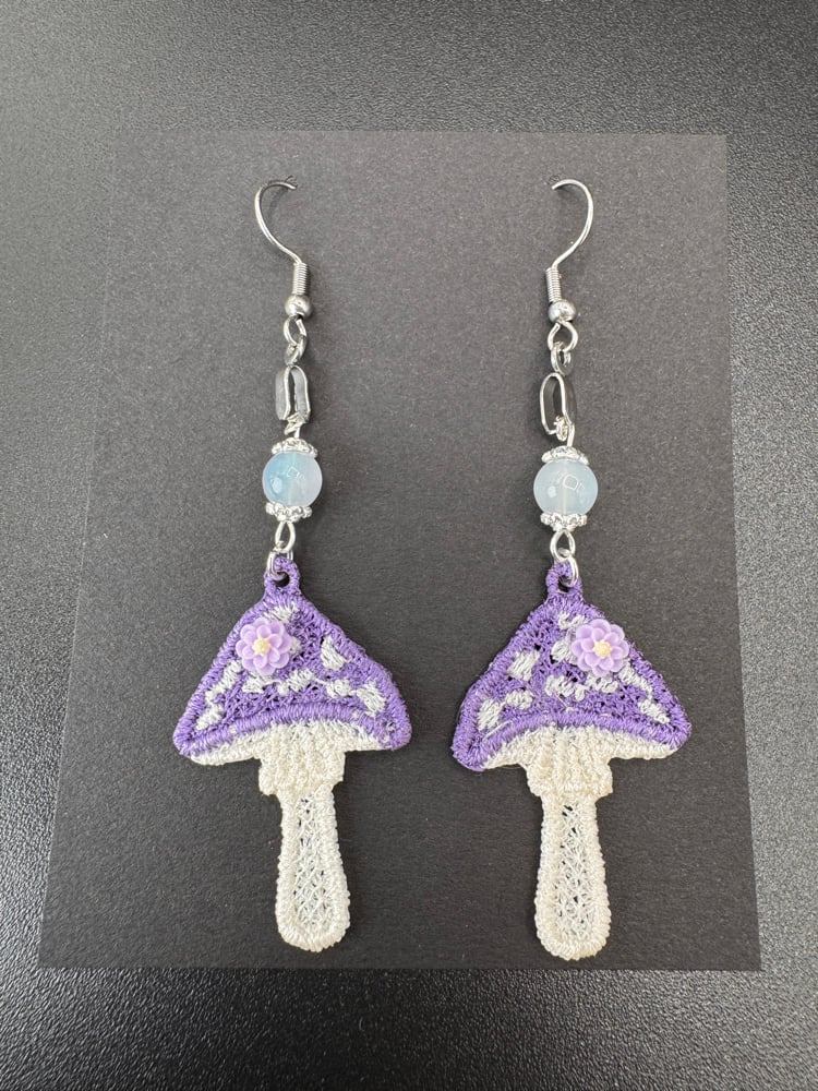These handcrafted purple mushroom earrings are made of purple and cream embroidery thread featuring a purple porcelain flower on each mushroom along with a beaded earring hooks.