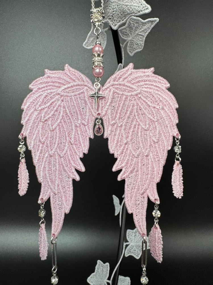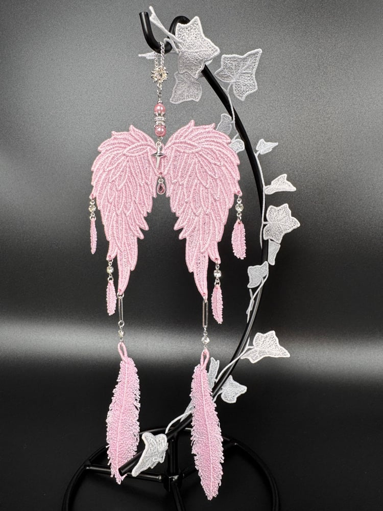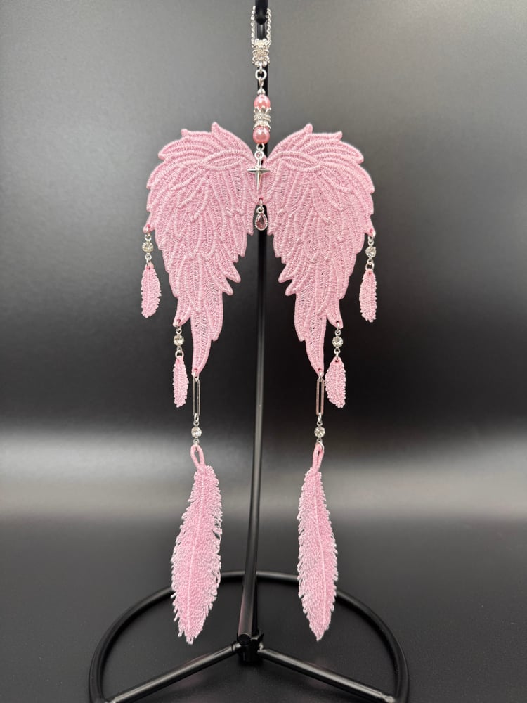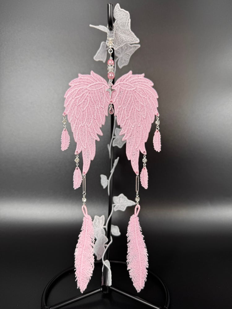 This handcrafted, angel wing Dreamcatcher is a highly gemmed and charmed Dreamcatcher featuring a pink pearl hanger and made with our favorite - most pastel pink.