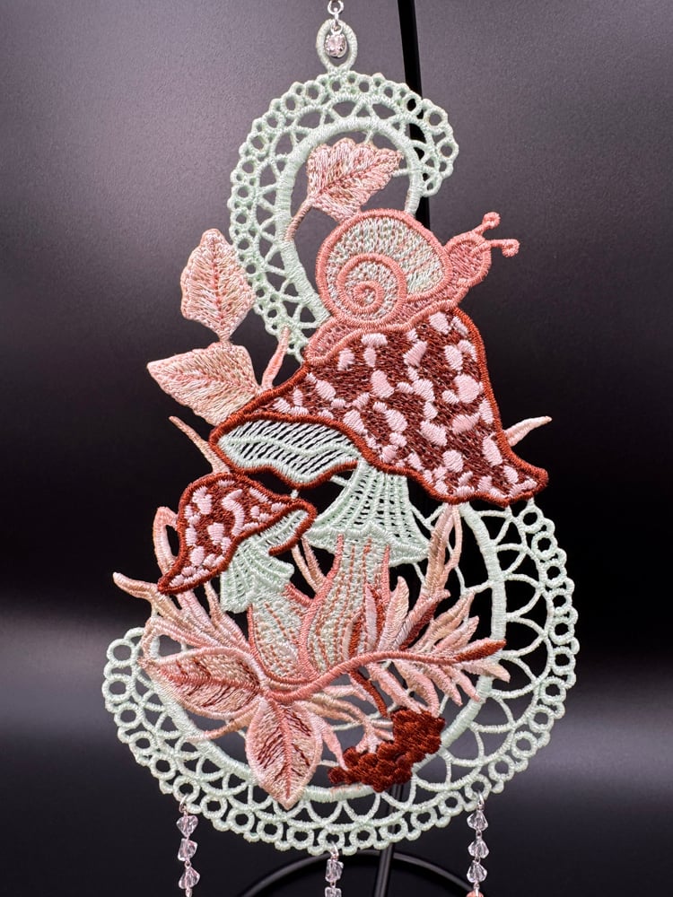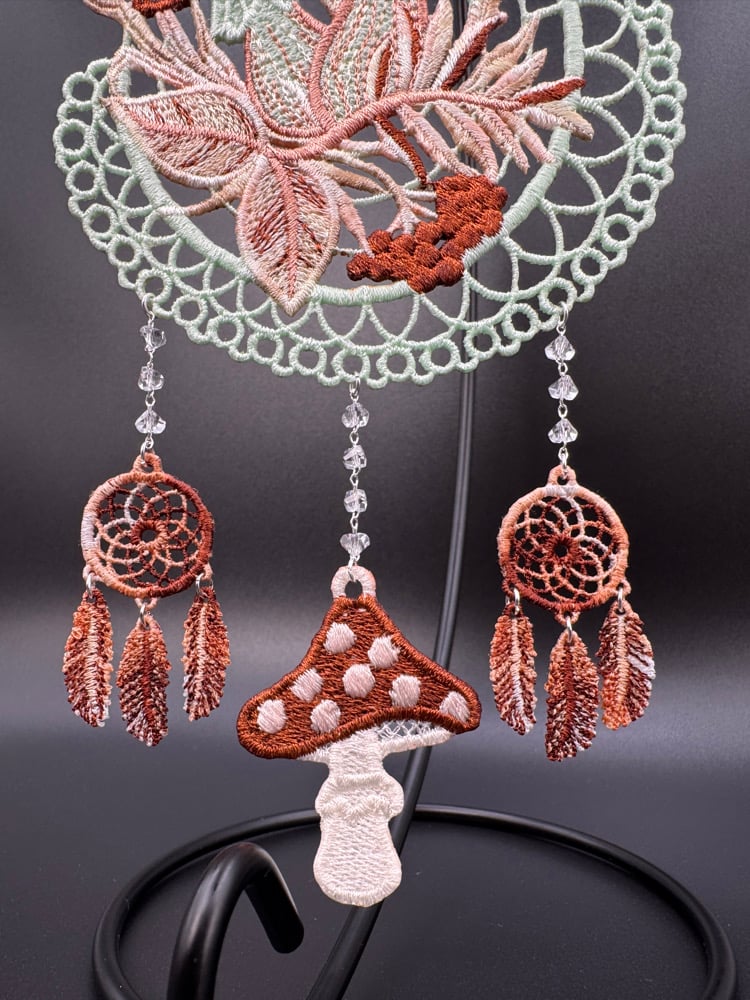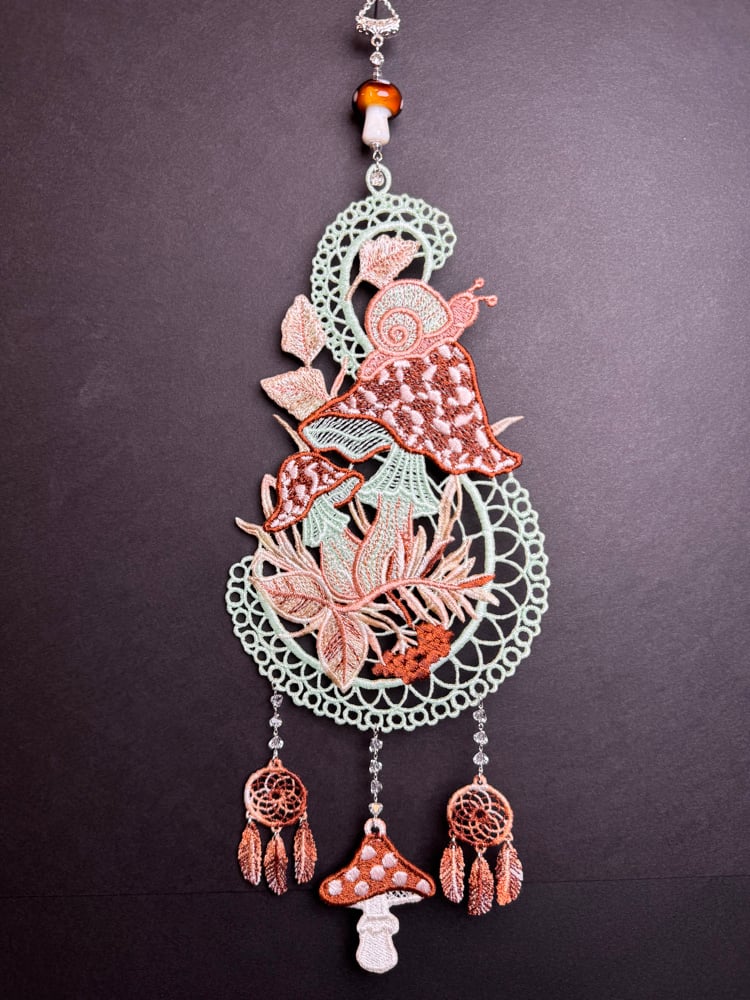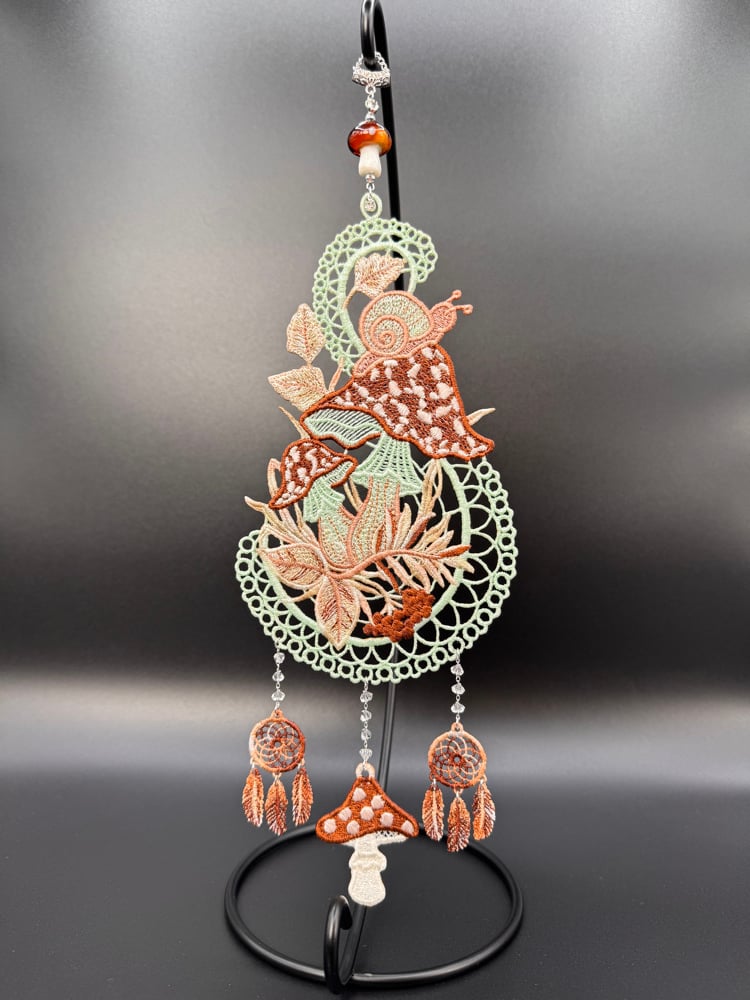 This very complex handcrafted, embroidered Snail & Shroom Dreamcatcher is made with a wide range of color including a variegated embroidery thread. This dreamcatcher features a miniature glass mushshroom hanger, two variegated miniature dreamcatchers, as well as a lone mushroom pendant.