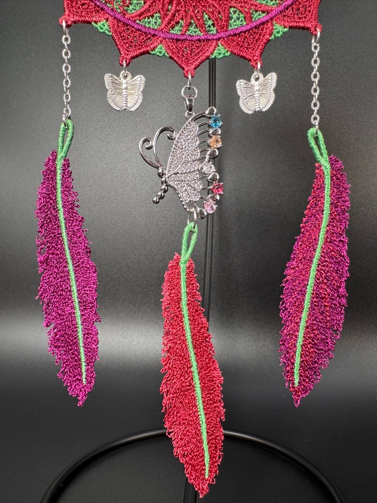 This handcrafted Tree Of Life Fairy Dreamcatcher features a variegated metallic rainbow fairy reaching for a butterfly, three full-size feathers, two mini butterfly pendants, and a large blinged butterfly pendant!